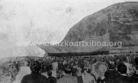Arrillaga enpresak Zarautzen egindako Larrabeiti itsasontziaren uretaratzea. Uretaratzea etzan ondo atera ontzia kanalean ondoa jota geratu baitzen. Ateratzeko Bilbotik etorritako eta bertara eraman zuen atoiontzi erabili zuten.