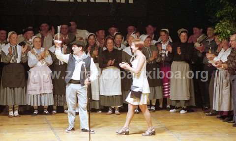 Irrintzi Taldeko kideak "Mutil Zar" lana antzezten, Zarauzko Zinema frontoian; ekitaldi hori Euskal Jaietako ospakizunen baitan burutu zen. Urte horretan, 1999ean, Zarautzen Euskal Jaiak hasi zireneko 75. urteurrena gogoratu zuten. Argazkian Maite Etxaniz alkatea taldeko kide batekin.