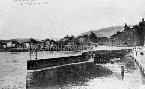 Reproducción de una postal editada por Anastasio Azcue, donde se ve en primer plano el puerto de Zarautz y al fondo la playa y el Palacio de Narros.