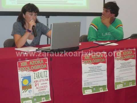 Mirene Begiristain (profesora de la UPV y técnico en marketing de alimentos ecologicos) y Aitor Larrañaga (miembro de la cooperativa Uztaro) en el coloquio celebrado tras la cata de tomate bilógico en la Plaza del Mercado con motivo de la XIII edición de la Feria Ecológica de Zarautz el 21 de agosto de 2009.
